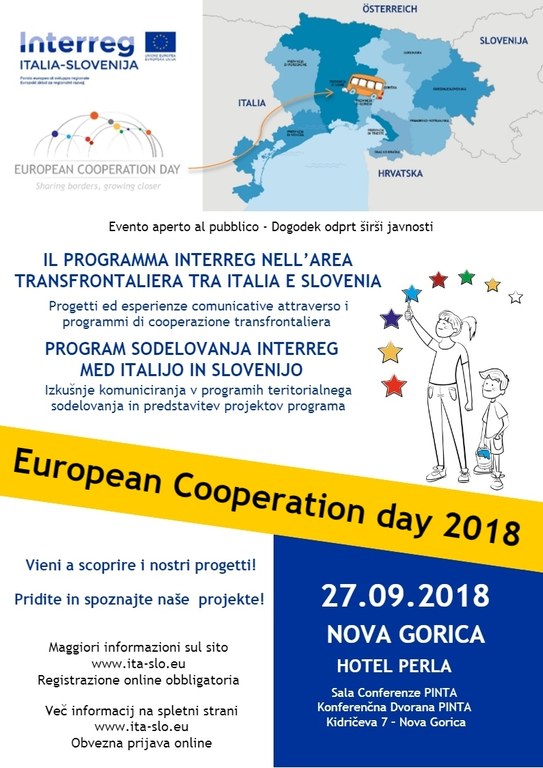 Program sodelovanja Interreg V-A Italija-Slovenija 2014-2020 organizira v sklopu Evropskega dneva sodelovanja (European Cooperation Day – EC Day) javni dogodek “PROGRAM SODELOVANJA INTERREG MED ITALIJO IN SLOVENIJO - Izkušnje komuniciranja v programih teritorialnega sodelovanja in predstavitev projektov programa”, ki bo 27. septembra 2018 v Novi Gorici. Na dogodku bo predstavljen program sodelovanja med Italijo in Slovenijo in vpliv sofinanciranih projektov na čezmejno območje.